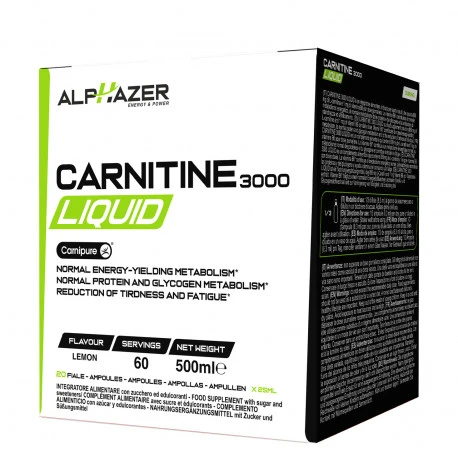 Alphazer® Carnitine 3000 Liquid Carnipure® est un complément alimentaire qui fournit 980 mg de L-Carnitine Tartrate Carnipure® et 333 mg d’Acetyl L-Carnitine par dose quotidienne. Chaque flacon contient une quantité impressionnante de 2 667 mg de L-Carnitine pure sous forme liquide. Carnitine 3000 Liquid contient également de la vitamine B6. La vitamine B6* contribue au maintien d’un métabolisme énergétique normal, au métabolisme normal des protéines et du glycogène et à la réduction de la fatigue et de la lassitude.