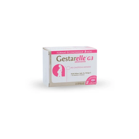 Dès le désir d’enfant et pendant toute la grossesse, votre alimentation doit être adaptée à vos besoins en vitamines et oligo-éléments. Grâce à sa formule complète, Gestarelle G & G3 Grossesse vous apporte au quotidien des nutriments adaptés notamment :La Vitamine B9 (appelée aussi acide folique ou folates) qui contribue à la croissance des tissus maternels durant la grossesse.L’iode qui contribue au bon fonctionnement de votre cerveau.Les Vitamines B qui contribuent à réduire la fatigue.