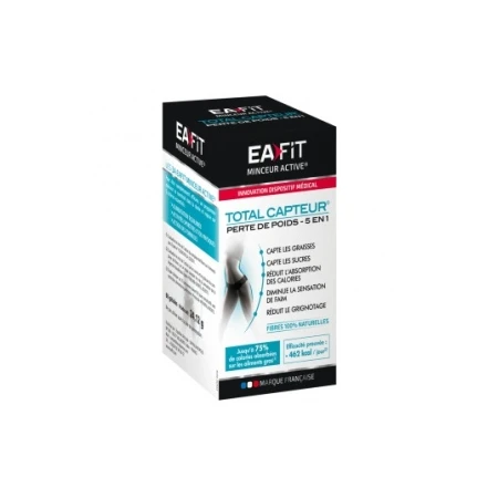 Total Capteur est une innovation d’Eafit Minceur Active, laboratoire N°1 en nutrition sportive. Ce capteur spécifique contient un complexe breveté de fibres 100% naturelles associant 5 actions décisives dans la perte de poids. Sans colorant ni conservateur, Total Capteur 5 en 1 capte les graisses, les sucres et les calories(1,2) tout en réduisant la sensation de faim et le grignotage(3) pour perdre du poids efficacement. Total Capteur bénéficie de plusieurs études d’efficacité :